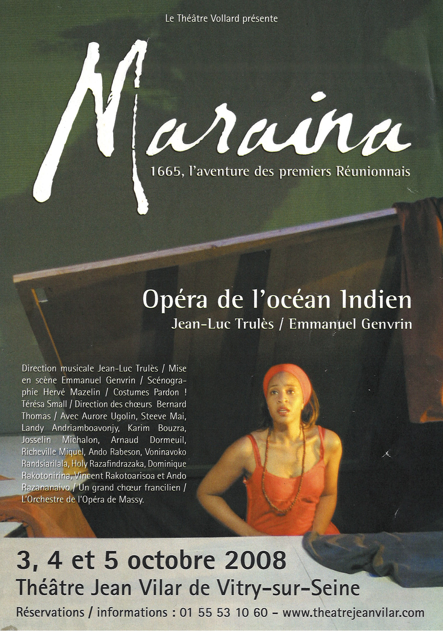 D’1h30 en français et malgache, sous-titré, sur une composition et une direction musicale de Jean-Luc Trulès, un livret et une mise en scène d’Emmanuel Genvrin, une scénographie d’Hervé Mazelin, des costumes Pardon ! et Térésa Small. Avec les solistes Aurore Ugolin, mezzo-soprano (Marie-Maraina) ; Steeve Heimanu Mai, baryton (Jean-Managna), Landy Andriamboavonjy ; Holy Razafindrazaka, soprano (Ravelo) ; Karim Bouzra, ténor (Louis Payen) ; Josselin Michalon, basse-baryton (Montaubon) ; Arnaud Dormeuil, Gilles Safaru, Léoplod Pauline, ténors (Thomas) ; Richeville Miquel, Herrick Rajaonnah, barytons (Kergadio) ; Dominique Rakotonirina (Ramossa), Ando Rabeson (Ando), Voninavoko Ranosiarilala (Kaze), Lova Raoelison, Ando Razananaivo, Vincent Rakotoarisoa, Holy Razafindrazaka (Antanosy). Il s’agit du premier opéra d’outre-mer français contemporain, sur un thème local, une musique empruntant aux rythmes ternaires de l’océan Indien, et mêlant à l’orchestre des instruments traditionnels.